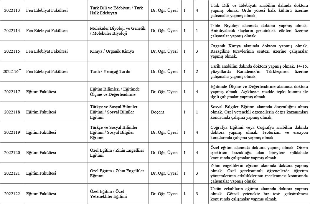 *Adayların; www.odu.edu.tr internet adresindeki Personel Daire Başkanlığı web sayfasından erişebilecekleri “Ordu Üniversitesi Öğretim Üyeliği Kadrolarına Başvuru ve Atanma Koşulları ve Uygulama Yönergesi”ne göre puanlama tablosunu hazırlayarak dilekçelerine ve yayın dosyalarına eklemeleri gerekmektedir.