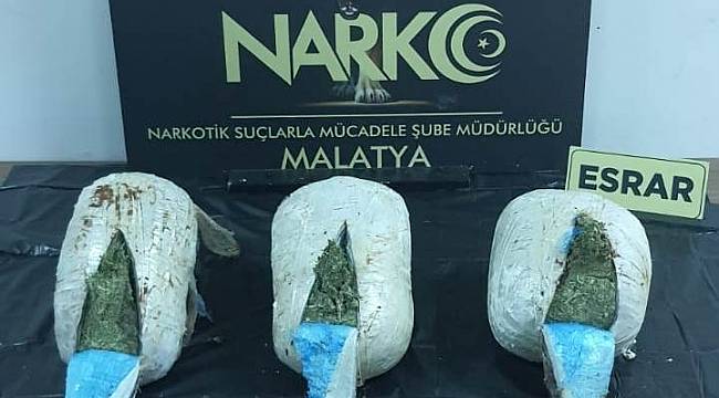 Malatya Emniyet Müdürlüğü ekiplerince Kale ilçesi yol kontrol noktasında doğu illerinden batı illerine sefer yapan yolcu otobüsünde bulunan bir şahsın eşyalarında yapılan aramada peynir bidonlarına gizlenmiş 3 paket halinde toplam 5 kilo 890 gram kubar esrar maddesi ele geçirildi. Olayla ilgili olarak gözaltına alınan Y.S. polis merkezine götürüldü.