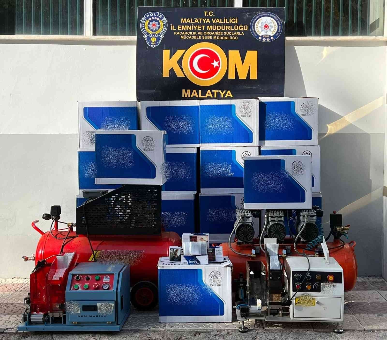 Malatya'da İl Emniyet Müdürlüğü Kaçakçılık ve Organize Suçlarla Mücadele Şube Müdürlüğü (KOM) ekipleri tarafından önceden belirlenen adreslere yapılan operasyonlarda 39 litre el yapımı sahte alkollü içki, 4 milyon 455 bin 200 adet bandrolsüz makaron, 2 adet elektronik sigara dolum makinesi ve 2 adet sigara dolum işleminde kullanılan hava kompresörü ele geçirildi.Olaylarla ilgili üç kişiye hakkında işlem yapıldı.