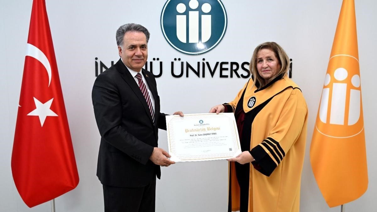 İnönü Üniversitesi Rektörü Prof. Dr. Nusret Akpolat, unvanda yükselen 3 akademisyene cübbelerini giydirdi.