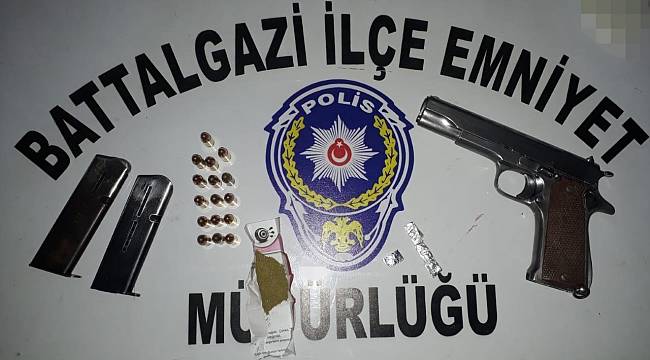 Edinilen bilgiye göre, Battalgazi İlçe Emniyet Suç Önleme ve Soruşturma Büro Amirliği görevlilerince İstiklal Mahallesi Bilgiç Sokak'ta durumundan şüphelenerek durdurulan bir araçta arama yapıldı. Otomobilde bulunan E.K. ve R.G.K. isimli şahısların üzerinden 1 adet ruhsatsız tabanca, 16 adet fişek, 4.54 gram sentetik kannobinoid ve 1,78 gram metemfetamin ele geçirildi. E.K. isimli şahısın kesici aletle yaralama suçundan arandığı anlaşıldı.