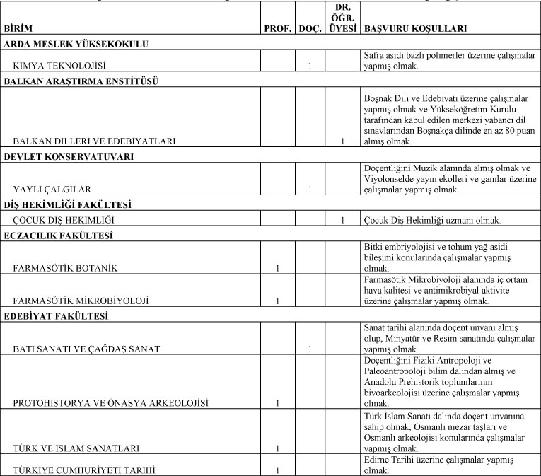 Yabancı ülkelerden alınan diplomaların denkliğinin YÖK tarafından onaylanmış olması gereklidir. Başvuru süresi ilanın Resmi Gazete’de yayınlandığı tarihten itibaren 15 gün olup, “Trakya Üniversitesi Öğretim Üyesi Atama ve Yükseltme Kriterleri’ne; https://pdb.trakya.edu.tr/pages/akademik-yukseltilme adresinden ulaşılabilir. Başvuru şartlarını taşımayan, süresi içerisinde başvuruda bulunmayan veya eksik belgeyle müracaat edenlerin başvuruları değerlendirmeye alınmayacaktır