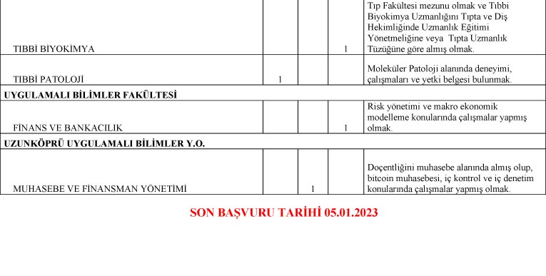 Doktor Öğretim Üyesi kadrolarına başvuru yapacak adaylar anabilim dalını belirten dilekçeleri ekinde 2 adet fotoğraf, lisans, yüksek lisans ve Doktora/Uzmanlık/Sanatta Yeterlik Belgesi, Yabancı Dil Sonuç Belgesi, özgeçmiş, kimlik fotokopisi, yayın listesi ile bilimsel çalışma ve yayınlarını kapsayan 1 takım dosya ve dosyadaki belgelerin aktarıldığı 4 adet USB bellek vereceklerdir