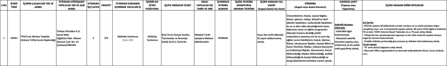 Türkiye Petrolleri Anonim Ortaklığı ülkemizin enerji bağımsızlığına giden yolda hız kesmeden arama ve üretim faaliyetlerini sürdürerek, ülkemizin hidrokarbon kaynaklarının milletin emrine sunulması görevini yürütmeye azim ve kararlılıkla devam etmektedir. TPAO’nun yurdun dört bir yanında ve mavi vatanda artan faaliyetlerine bağlı olarak personel ihtiyacı doğmuştur. Bu ihtiyacın karşılanması için TPAO merkez ve taşra teşkilatına toplam 5 (Müfettiş Yardımcısı) personel alımı yapılacaktır.