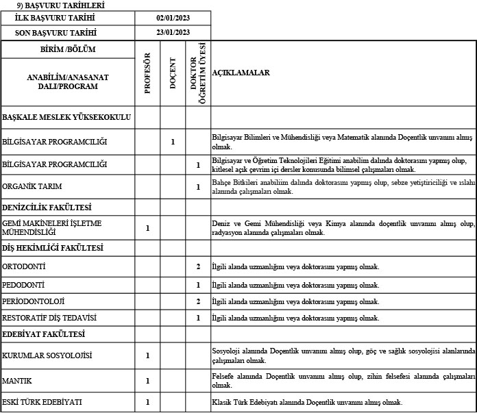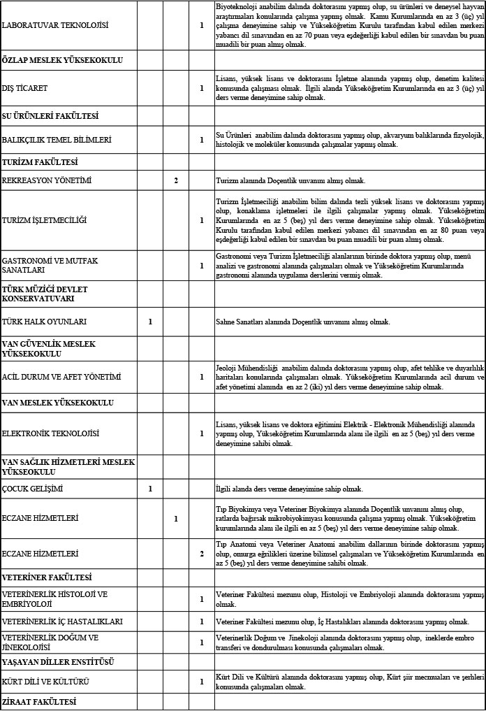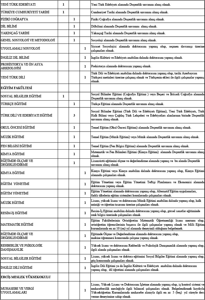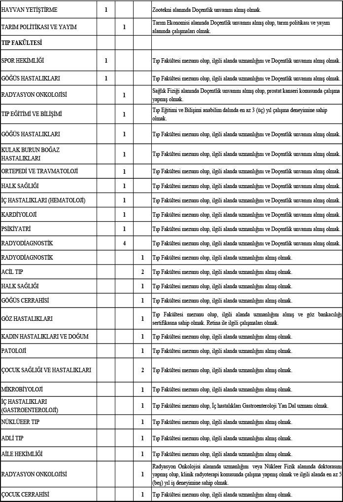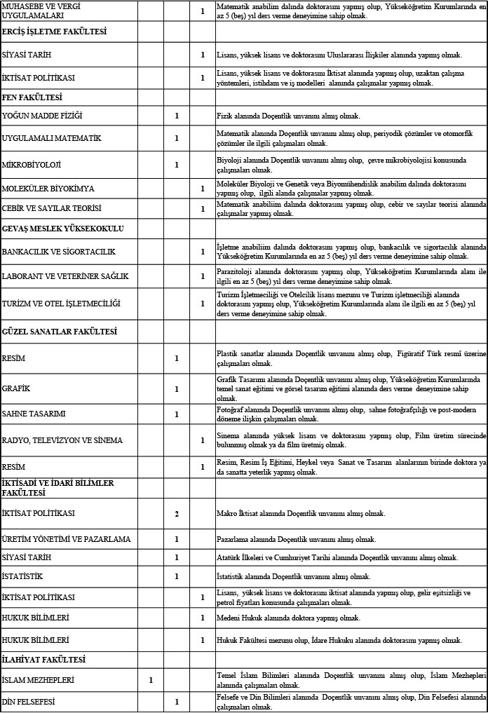 2) Doçent kadroları daimi statüde olup, başvuracak adayların başvuracakları Anabilim Dalını belirtir dilekçe, özgeçmiş, hizmet belgesi ve yabancı dil sınav sonuç belgesi, fotoğraf, kimlik fotokopisi, lisans, yüksek lisans, doktora veya uzmanlık diplomaları ile doçentlik belgesi, erkek adaylar için askerlik durum belgesi, adli sicil belgesi, bilimsel eser, çalışma ve yayınlarını 4 (dört) adet USB Bellek ortamına aktarıp Rektörlüğe,