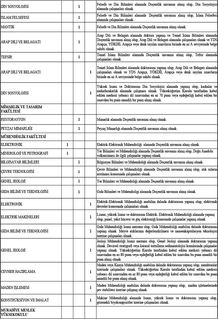 1) Profesör kadroları daimi statüde olup, başvuracak adayların başvuracakları Anabilim Dalını belirtir dilekçe, özgeçmiş, hizmet belgesi ve yabancı dil sınav sonuç belgesi, fotoğraf, kimlik fotokopisi, lisans, yüksek lisans, doktora veya uzmanlık diplomaları ile doçentlik belgesi, erkek adaylar için askerlik durum belgesi, adli sicil belgesi, bilimsel eser, çalışma ve yayınlarını 6 (altı) adet USB Bellek ortamına aktarıp Rektörlüğe,