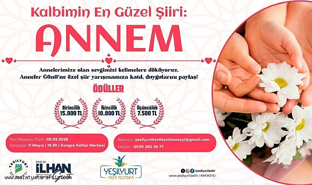 Yeşilyurt Belediyesi ile Yeşilyurt Kent Konseyi, Mayıs Ayının ilk haftasında kutlanacak olan Anneler Günü'nün anlam ve önemine yakışır özel bir etkinliğe imza atıyor. "Kalbimin En Güzel Şiiri: Annem" temalı şiir yarışmasıyla, annelere duyulan sevginin ve bağlılığın en içten ifadelerle kaleme alınması hedefleniyor.