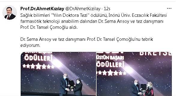 Rektör Kızılay açıklamasında, "Sağlık bilimleri "Yılın Doktora Tezi" ödülünü, İnönü Üniversitesi Eczacılık Fakültesi farmasötik teknoloji anabilim dalından Dr. Sema Arısoy ve tez danışmanı Prof. Dr. Tansel Çomoğlu aldı. Dr. Sema Arısoy ve tez danışmanı Prof. Dr. Tansel Çomoğlu'nu tebrik ediyorum. "Santral Sinir Sistemine Yönelik Nanopartiküller İlaç Taşıyıcı Sistemlerin Geliştirilmesi ve Parkinson Hastalığında Tedavi Etkinliğinin Değerlendirilmesi" teziyle Dr. Sema Arısoy ve tez danışmanı Prof. Dr. Tansel Çomoğlu'na Sayın Cumhurbaşkanımız ödül verdi " ifadelerine yer verdi.